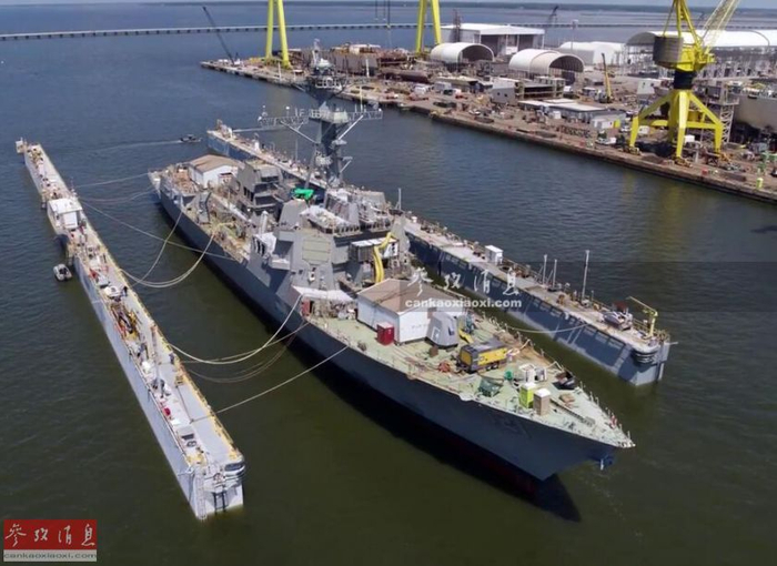 驱逐舰就位后,浮船坞驶离码头,并在距离岸边几百米的水域停泊。