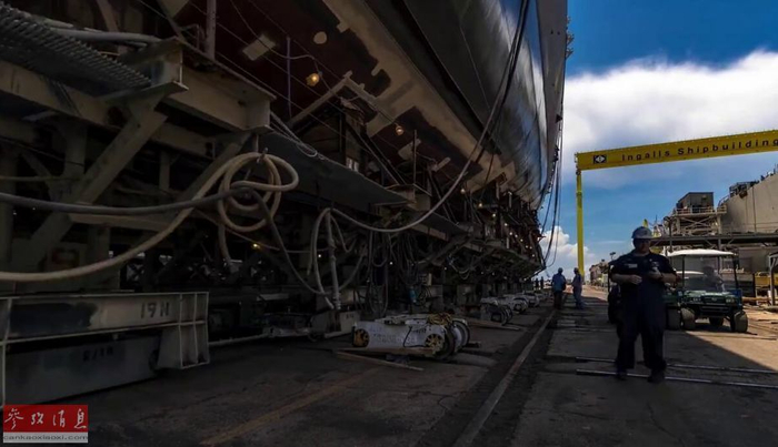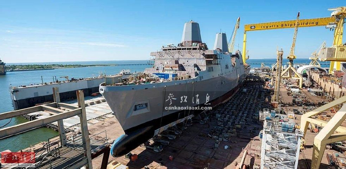 图为在建中的“约翰·P·默撒”号(LPD-26)船坞登陆舰,后方可见英格斯造船厂的巨型龙门吊。