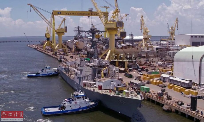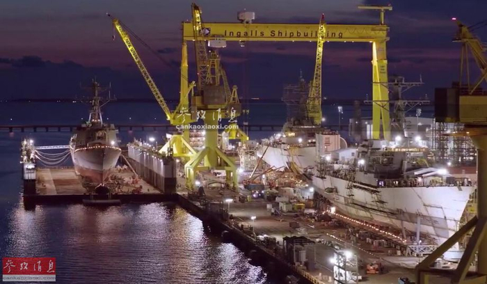 亨廷顿·英格尔斯造船厂是美国国内最大的军用造船厂之一,位于密西西比州的帕斯卡古拉市,该厂始建于1938年。20世纪50年代开始的冷战期间成为了该厂确立“龙头”地位的黄金时期,1957年,英格尔斯造船厂赢得了为美海军建造12艘攻击型核潜艇的项目,此后各种大型战舰订单接踵而至。图中可见3艘伯克级驱逐舰和一艘海岸警卫队巡逻舰,均由该厂建造。