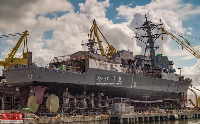 在码头舾装位置就位后,“彼得森”号的下水工作已全部完成,图中的码头船台上还能看到2艘在建中的伯克级。