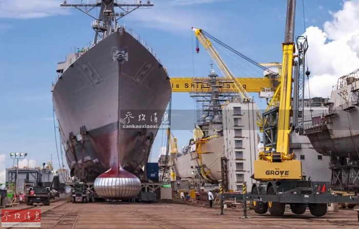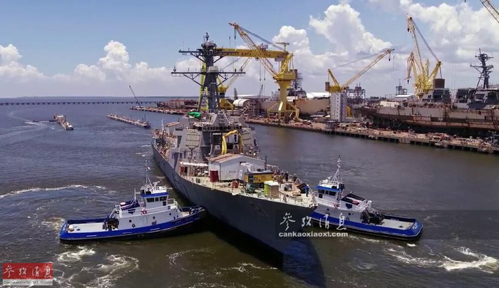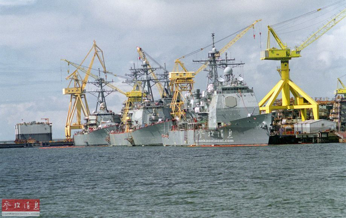 船厂资料图,可见2艘伯克级驱逐舰和一艘提康德罗加级导弹巡洋舰。