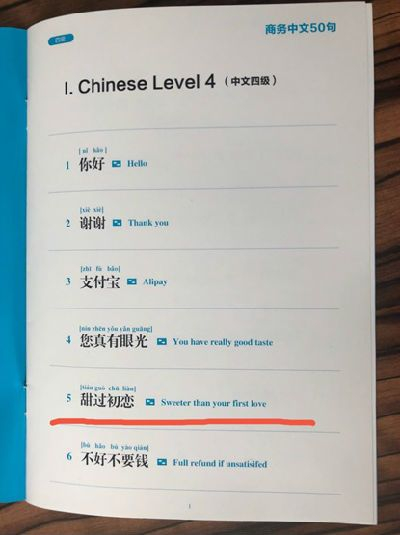 “蓝宝书”里面包括了四级、六级、八级中文,不仅在后面跟上英文翻译,还在中文上面标注了拼音。基本覆盖了商户与中国顾客之间的日常交流。