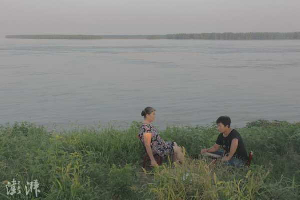 2016年7月26日,簰洲湾大堤,两位守堤村民。 周平浪 图
