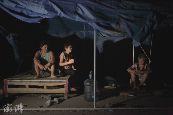 2016年7月29日晚上,三位在堤上值守的老人,岁数最大的有70多岁,因为丈夫需要下地干活,多数时候由她们承担防汛的义务。 周平浪 图