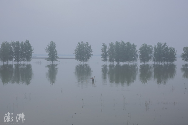 2016年8月1日,簰洲湾镇,一位村民在长江捕鱼,远处的防汛林还有部分淹没在水下。 周平浪 图