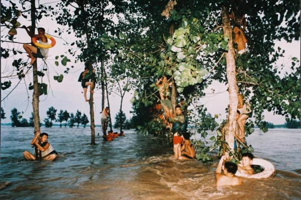 1998年8月1日,湖北簰洲湾,江堤溃口后,人们爬到树上避难。 视觉中国 图