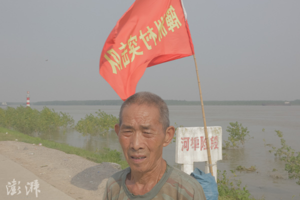 2016年7月27日,簰洲湾大堤,71岁的村民罗春森在烈日下防汛。 周平浪 图