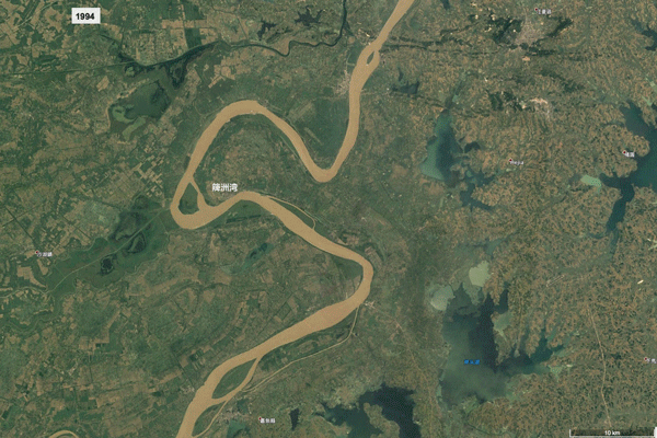 1994年至2018年簰洲湾在地图上的变化,簰洲湾的东北边即是武汉三镇。