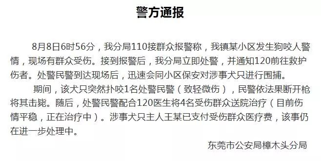 东莞市公安局樟木头分局发布通报称,8月8日6时56分,该分局110接群众报警称,樟木头某小区发生狗咬人警情,现场有群众受伤。接到报警后,分局立即处警,并通知120前往救护伤者。处警民警到达现场后,迅速会同小区保安对涉事犬只进行围捕。