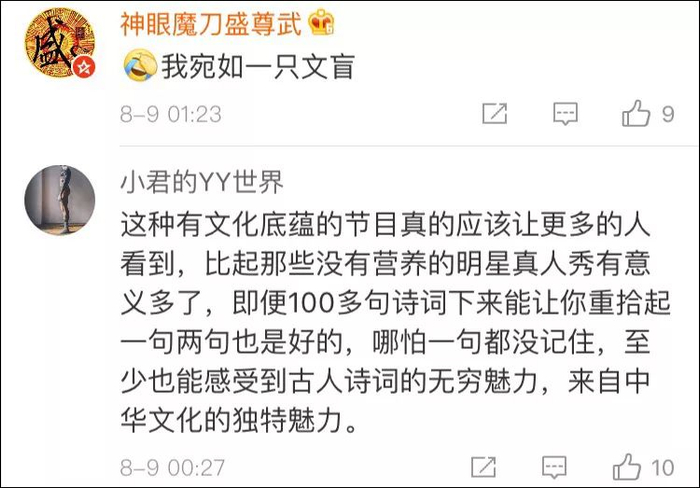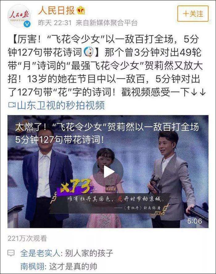 节目播出后,这段“飞花对决”的视频更引得《人民日报》等媒体的微博纷纷转发。