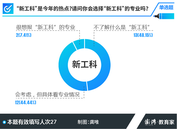 不久前,教育部印发了《关于公布首批“新工科”研究与实践项目的通知》,共有来自全国高校的612个项目入选,包括人工智能、大数据、智能制造等热门专业方向在内的19个项目群涵盖其中。相关专业也颇受考生关注,超过一半的受访考生“会考虑及很想报考新工科专业”。