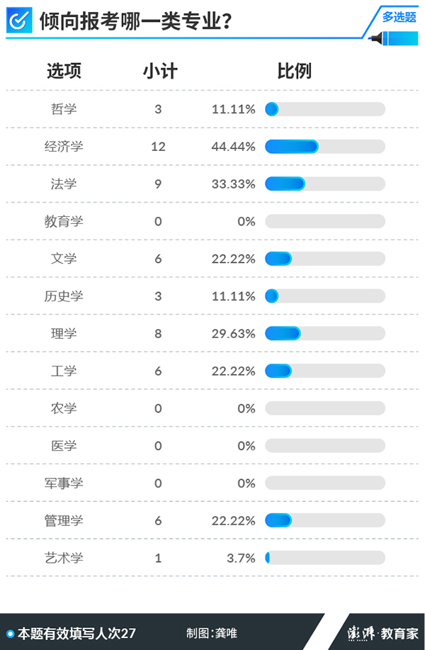 澎湃新闻的此次调查显示,学霸考生所选的热门专业主要指向仍为“经济学”和“管理学”,在问卷关于“倾向报考哪一类专业”的多选题中,44.44%的受访考生选择了经济学,而选择管理学类的受访考生数也达到了22.22%。