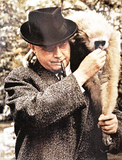 《狄仁杰之四大天王》的末尾,大白猿载着法师从天而降,并肩赵又廷与封魔族鏖战正酣,本是生死一线,我却乐出了声,因为无法克制地想起高罗佩与其爱猿的经典合照:它伏在他的肩头,他拽着它的小手。毕竟某次和好友喝了点小酒,高罗佩喃喃自语过“狄公就是我”,《长臂猿考》又恰好是他最后一本汉学著作。若天堂有知,徐老怪安排了这场戏,他大概会直呼过瘾,抚琴一曲又黯然神伤:“但恨衰朽之质,所不见尔!” 高罗佩与其爱猿
