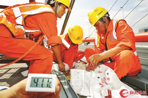为将景观灯安装到桥侧,工人们需先安装桥架,再在桥架里安装电缆。为了安装桥架,还做了一个挂篮,挂篮一端压上600斤的石块,用两根保险绳固定在桥面上,工人身上再系上一根保险绳才能爬进伸出桥面的篮子里。篮子仅容一个人站立,施工人员拧膨胀螺丝时都要多次变换姿势,双手交替拧。每安装一处,又要爬出挂篮,待挂篮移动后再安装另一处。为了大桥的景观提升工程,施工者们在41℃多的高温下,一刻不敢懈怠。