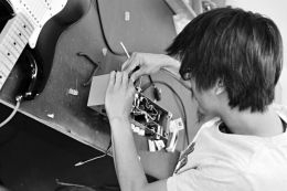 随后,王玮开始尝试自己动手制作电吉他和效果器。电吉他效果器是改变吉他原有音色或叠加音响效果的设备,它是一把电吉他的灵魂所在。当时没有木材,他就从村里找不易变形的核桃木;不会打磨,他就去缠着木匠学习;没有做品丝的铜,他就用竹签打磨代替;没有拾音器,他就找来旧的继电器改装……此时,王玮上学时收获的扎实物理知识和对电吉他的喜爱,以及在电脑论坛上的零碎学习,竟让他亲手制作了自己的第一把电吉他和效果器。