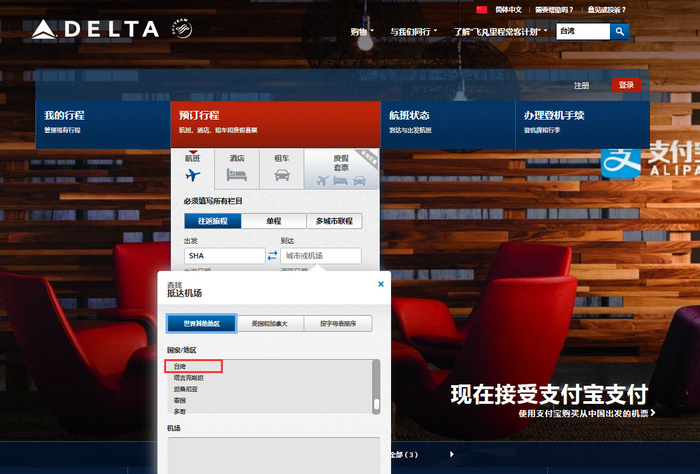 观察者网查询发现,达美航空和美国联合航空公司动作最慢,官网上机场“国家/地区”一栏,仍可见“台湾”选项,并与其他国家和地区并列。