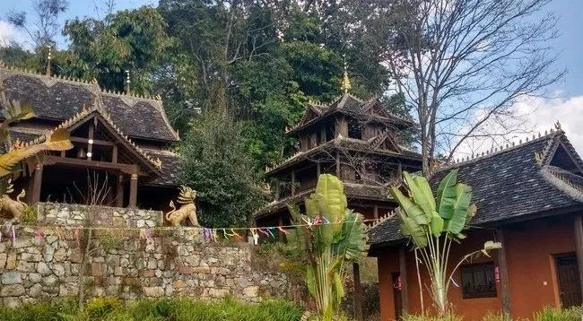 村寨口可见一座庄严宏伟的布朗族寺庙,块石垒砌的基座,重檐阔脊的正殿,乌瓦朱墙的角楼,虽然不难看出历经年代依旧,却依旧不减宏伟庄严——布朗族信奉小乘佛教,这里虽然已经不再有僧侣居住于此,却依然是村民们祭祀和调节纠纷的重要场所。