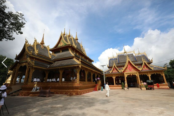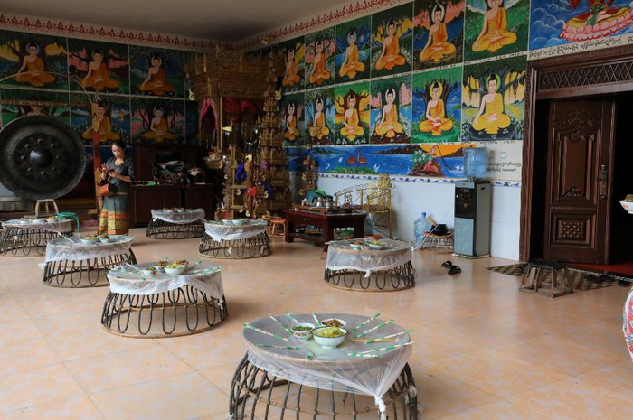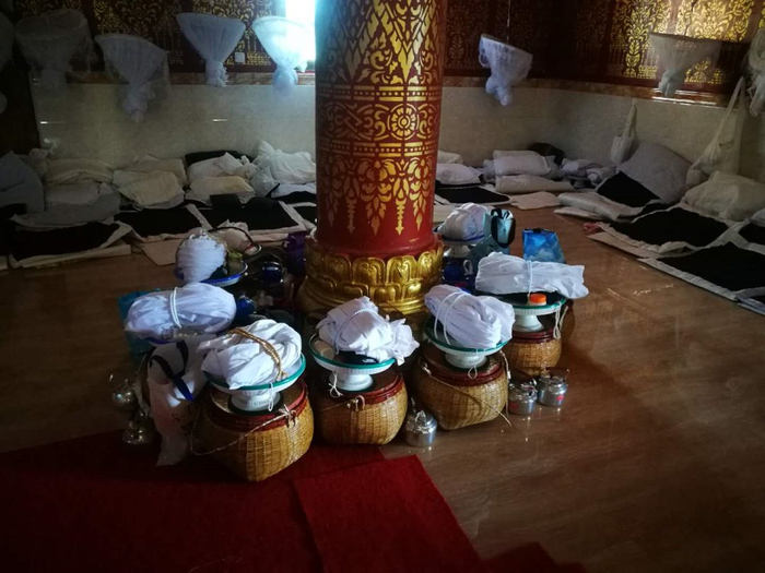 脱鞋进入佛殿内部,除了极具西双版纳色彩的佛像外,佛殿内的四周还能见到修行者们的铺盖被褥与行李——来此进修的修行者们会将自己的行李带来这里,进行为期数日的修行,吃住皆在寺内,住所就在大殿里。