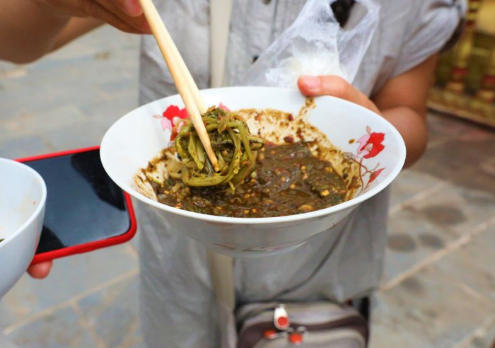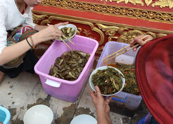 见到我们在旁边拍照,分发糯米饭的傣族姑娘还热情的递给我们一人一包糯米饭和一碗斋菜,当我们提出要付钱的时候,他们却拒绝了。