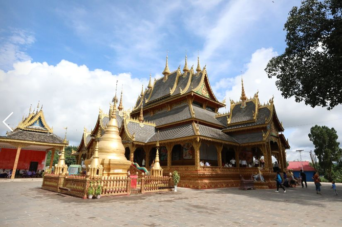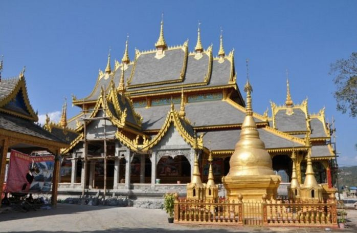 该建筑群由大殿、鼓房、僧房、戒堂、佛塔、山门等建筑共同组成,八角寺就是南传上座部佛教建筑中佛爷诵经忏悔、开会议室之地的戒堂。从景真佛寺门口进入,沿层层叠叠的台阶路拾级而上,便可见金光晃晃的景真寺大殿。