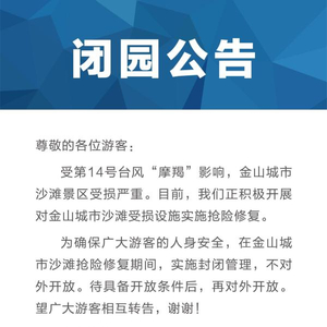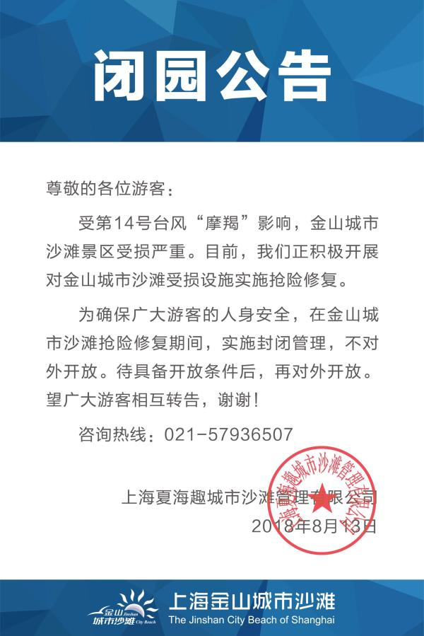 为此,上海金山城市沙滩今天发布的最新闭园公告称,为确保广大游客的人身安全,在金山城市沙滩抢险修复期间,实施封闭管理,不对外开放。待具备开放条件后,再对外开放。