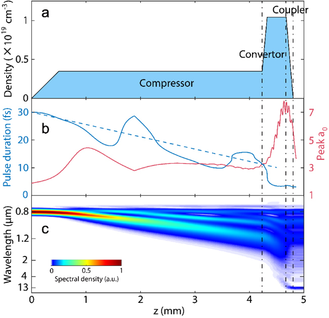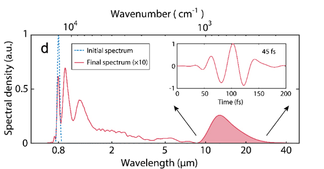 然而由于高次谐波产生机理的限制,利用现有近红外波长(0.8-3.9μm)飞秒强激光已经遇到技术瓶颈,原理上需要更长波长(5-10μm)的近单周期飞秒强激光才能有效的实现更短阿秒脉冲,以及更短光子波长(硬X射线)的目标。而且理论模拟显示,9μm左右波长的近单周期飞秒强激光甚至能够有效产生小于1阿秒的脉冲结构,也就是说有望将人类可操控时间尺度推进到仄秒(~10-21 s)范畴!遗憾的是,在产生5μm以上波长的飞秒近单周期强激光方面,传统晶体非线性光学的思路遇到难以逾越的挑战。由于缺乏相应的宽带非线性光学晶体,长期以来准单周期飞秒中红外强激光的波长一直止步于4μm以下。而这一限制,也是当前制约阿秒科学向更短脉冲及更高光子能量迈进的瓶颈所在。