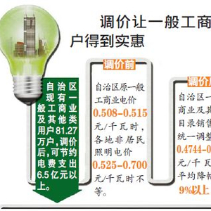 据测算,自治区一般工商业及其他类用电目录销售电价平均降幅9%以上。调价前,自治区原一般工商业电价0.508-0.515元/千瓦时,各地非居民照明电价0.525-0.700元/千瓦时不等。调价后,自治区一般工商业及其他类目录销售电价统一调整为0.4744-0.4814元/千瓦时,平均降幅9%以上。