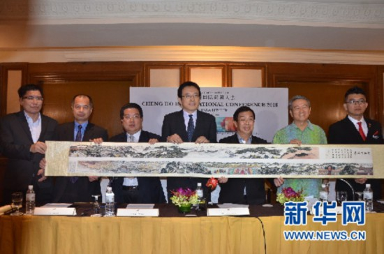 马来西亚总理对华事务特使陈国伟(右3)、中国驻马大使馆文化处主任张杰鑫(左4)、中国郑和研究会副会长孙治国(左3)等嘉宾在新闻发布会上展示王新循创作的《郑和下西洋》长卷复制品。( 新华网记者 王大玮 摄)