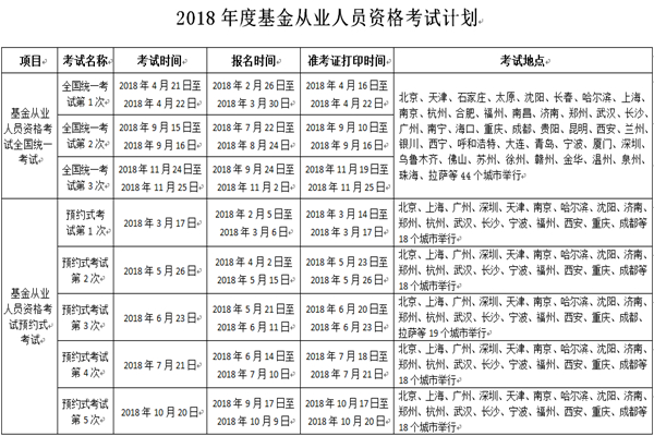 基金从业资格考试分为全国统考和预约式考试两种形式,中国证券投资基金业协会2018年度考试计划中,基金从业人员资格考试全国统一考试3次,预约式考试5次。具体时间安排如下图所示。