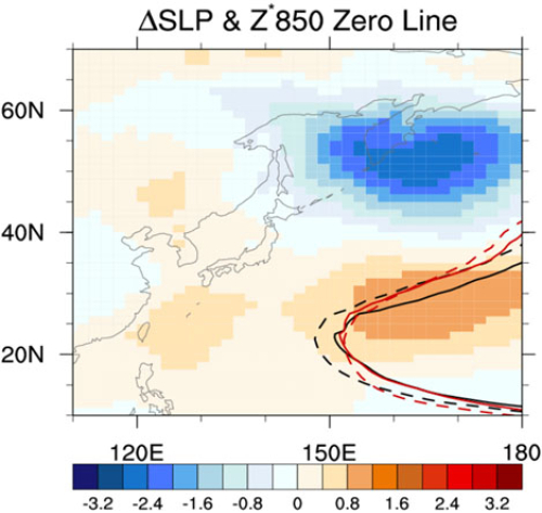 图3.RCP8.5情景下,HadGEM3-GC2的N216和N96分辨率预估的海平面气压的变化。等值线为850hPa位势高度零线,表示西太副高的位置,其中实线表示N216,虚线表示N96,黑色表示当前时段,红色表示未来预估时段。