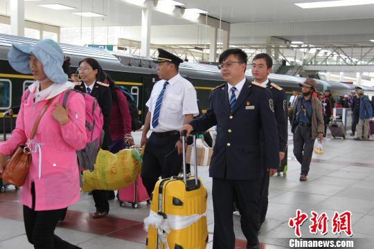 图为拉萨站乘务人员协助旅客搬运行李。资料图 拉萨站供图