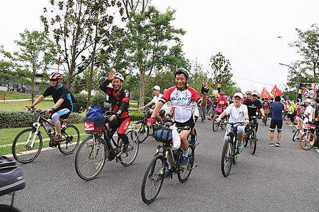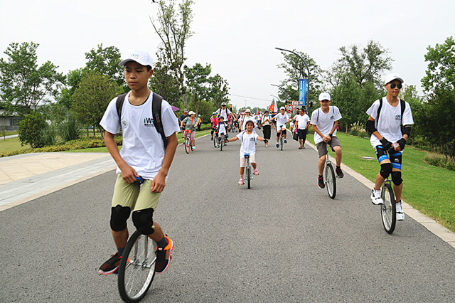 上午8点半活动开始,活动参与者从南京生态科技岛科创中心的国际水中心出发,来到中心旁边的环洲马拉松赛道上,“愉快骑”骑行团近30名身着骑行服的骑行者,骑着运动自行车“一马当先”;南京阳光独轮车俱乐部的20多辆独轮车紧随其后,其中不少是即将要参加全国独轮车锦标赛的尖子选手;最后是近百人的健步者徒步行走。