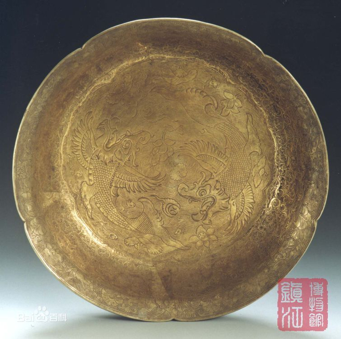 1982年,镇江丁卯桥附近大运河一处汊道西岸的坡地上,发现唐代银器窖藏,一个银质酒瓮内出土了银涂金龟负“论语玉烛”、“酒令筹”、“鎏金银熏炉”等珍贵文物。其中,就有一件鎏金鱼化龙纹银盘,底面錾刻一对翘尾展翼、睁目张口的鱼化龙,间以莲花、荷叶和七条游鱼。有研究者认为,这一对晚唐银器上的“鱼化龙”其实就是摩羯。