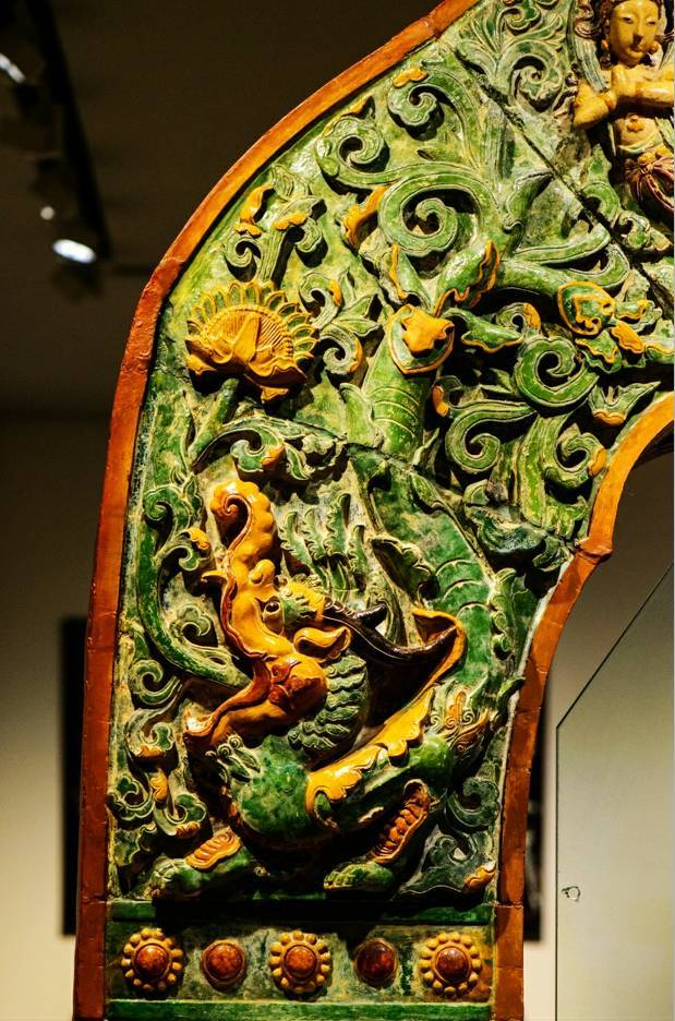 去年年底,南京博物院三件国宝被《国家宝藏》隆重推出,最终,大报恩寺琉璃拱门进入国家宝藏特展名单。仔细看这座美轮美奂、叹为观止的门,你也能发现摩羯。琉璃拱门上共有六种动物形象组合,合称“六拏具”,是藏传佛教中的法相装饰,居于龙女和飞羊之间的就是摩羯。在《佛说造像量度经》中,它被称为“布啰拏”,长鼻、利齿、鱼身,可吞噬一切,有保护之相。在南京午朝门遗址公园内,一座雕刻异常精美的石屏风上,记者也“捕捉”到一对摩羯,它们在波浪中翻腾跳跃,掀起巨浪,跃然欲出。 交汇点记者 于锋