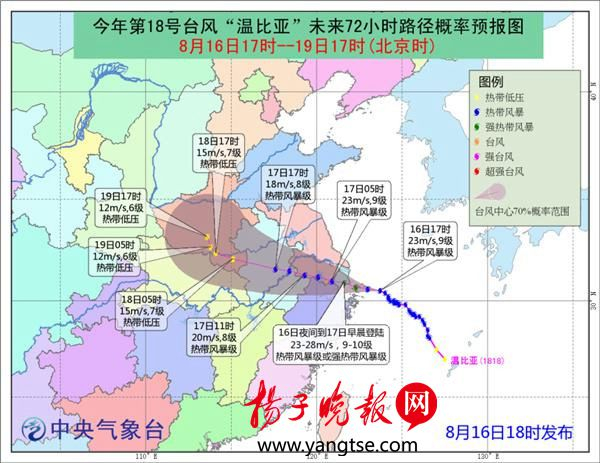 扬子晚报网8月16日讯(记者 于丹丹)“当日生成,当日出仓,次日送达登陆,江浙沪包邮!”现在,就请签收你的台风“温比亚”!虽然是“横空出世”,但“温比亚”的影响力并不输之前已经造访过我们的台风,预计18号台风“温比亚”将于16日后半夜到17日凌晨在上海到嘉兴一带沿海登陆。受其影响,16日夜间到17日,江苏大部分地区风力可达6-7级阵风9级左右,江河湖面及江苏沿海海面风力可达8-9级阵风10-11级。淮河以南大部地区将出现6小时50毫米以上强降水,部分地区可达100毫米,并可能伴有雷雨大风等强对流天气,请各方注意防范。