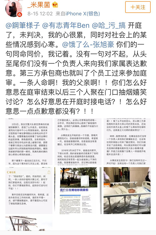 “_米果菌”还称,饿了么作为肇事方公司,事发后一直未表达任何歉意,而肇事方人员在法庭上的态度更表现得极为轻慢,“一条人命,你们怎么好意思在庭审结束以后三个人聚在门口抽烟嬉笑讨论?怎么好意思在开庭时接电话?怎么好意思一点点歉意都没有?”