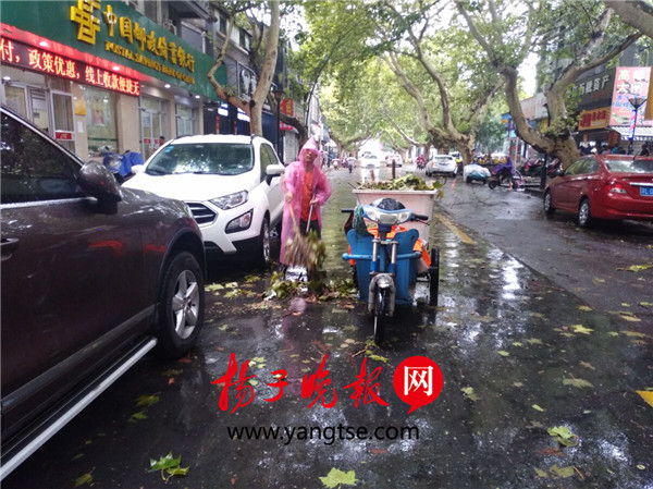 顶风冒雨坚守岗位 镇江环卫工全天清扫枯枝落叶达70吨