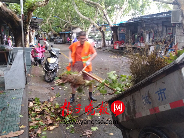 原标题:顶风冒雨坚守岗位 镇江环卫工全天清扫枯枝落叶达70吨