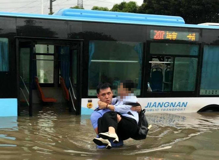 公交车被淹,10多人被困,交警趟水“公主抱”帮脱险