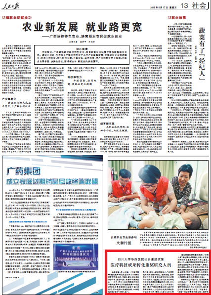 编者按:人民日报8月16日13版、人民网8月14日以《四川大学华西医院出台激励政策疗科技成果转化重奖研究人员》为题,对我校华西医院推进成果转化系列激励政策作了报道。全文如下: