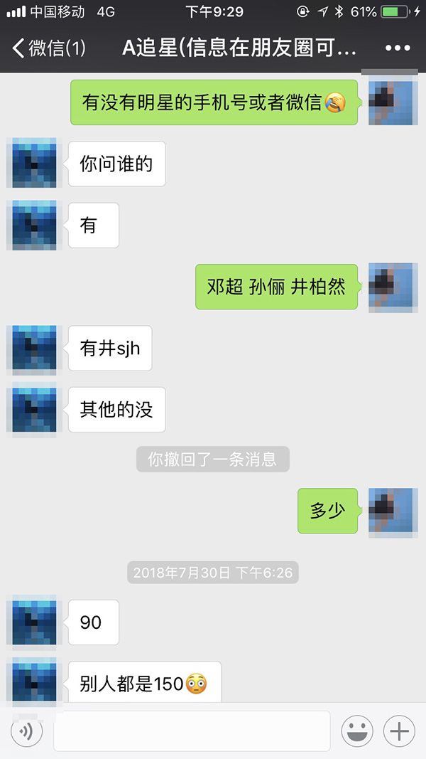澎湃新闻记者又问对方是否有明星的手机号码或者微信时,仅黄牛A称有部分明星手机号销售,如:“井柏然”的,原价150元一个,现在熟人,(折扣价)90元一个。