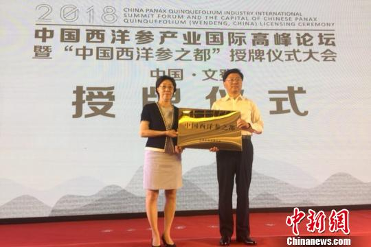 中新网威海8月21日电 (王娇妮 张小寒)记者21日从威海市文登区委宣传部获悉,2018中国西洋参产业国际高峰论坛暨“中国西洋参之都”授牌仪式大会20日在北京举行,会上“中国西洋参之都”正式授牌文登。