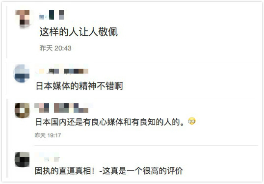 日本网友则表达感谢称:该片通过缜密的调查报道,(让观众)知道了南京大屠杀。有人提醒道:当时日本军队不只在南京,而是在全中国都实施了暴行。