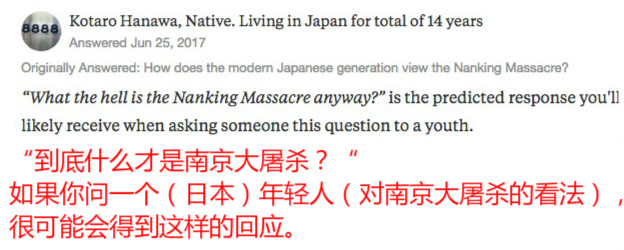 事实上,很多日本年轻人甚至都没听过“南京大屠杀”这种说法。一位日本网友在问答网站Quora上留言道:“第一次听到南京事件并非在学校,而是在学校旅行中听到讲座。而大部分同学对那段历史并不感兴趣,在学校也没机会学到。”