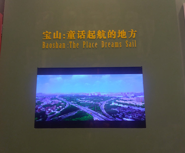 不过,比起参展童书,另外的两段文字可能更值得玩味。在童书屋的入口,播放着一段介绍今日宝山城市风光的宣传片,上方写着“宝山:童话起航的地方”。这无疑是寓意了宝山乃是作为儿童文学大师的陈伯吹的家乡。而在童书屋的图书展架上,也写着“为小孩子写大文学”八个大字。