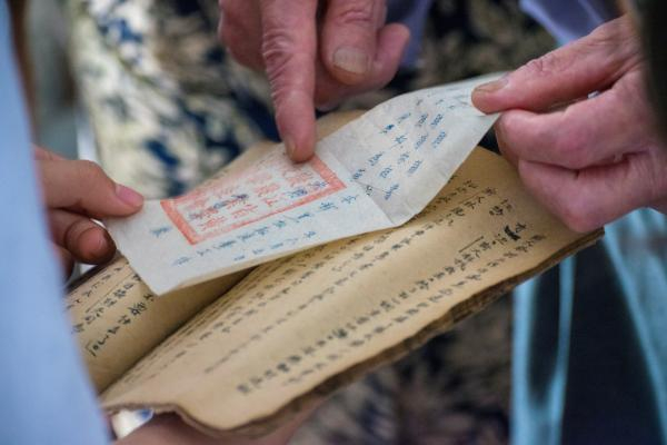 悦来村张定白老人向温州医科大学学生展示聘请书以及手抄书本。 刘乞学 摄