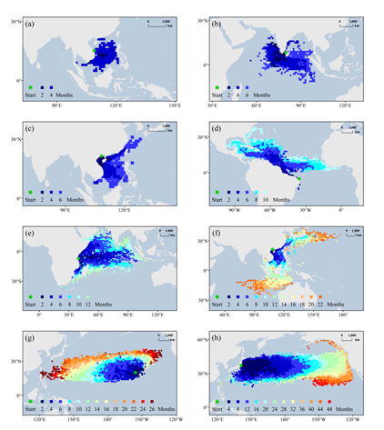 图3 对种子跨洋长距离扩散进行洋流模型模拟分析