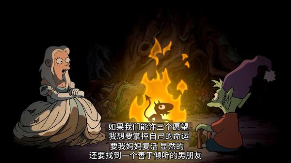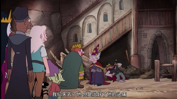 像所有马特·格罗宁作品一样,《幻灭》中也能看到对若干经典作品的调侃与颠覆式戏仿,托尔金的中土大陆、乔治·R·R·马丁的维斯特洛大陆场景散见于动画片中,迪士尼经典冒险类奇幻作品的影子也笼罩在《幻灭》之上,中世纪故事中必备的魔法、奇珍异兽、巨人、精灵、矮人、公主、骑士……应有尽有,随处可见。但这些元素更像是彩蛋,静态地等待被发现,而没有动态地在剧中发挥应有的作用。