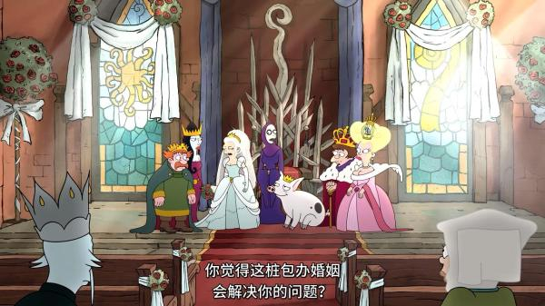不把《飞出个未来》《辛普森一家》和《幻灭》做比较,独立地看《幻灭》,它也不失为一部有趣的作品,乍看上去是一部反“迪士尼童话故事”的动画片,主角被设定成梦之国的公主蒂亚碧妮。这个角色一开口,马特·格罗宁作品的忠实观众就会觉得耳熟,给“小碧”公主配音的艾比·雅各布森也在《飞出个未来》和《辛普森一家》系列中献过声,角色还是前作里的那种角色,有血统纯正美国大妞的风范,敢闯敢干、又丧又浪。