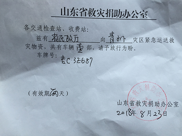山东省救灾捐助办公室8月23日出具的致各交通检查站、收费站“请予放行为盼”的凭证。 澎湃新闻记者 张家然 图